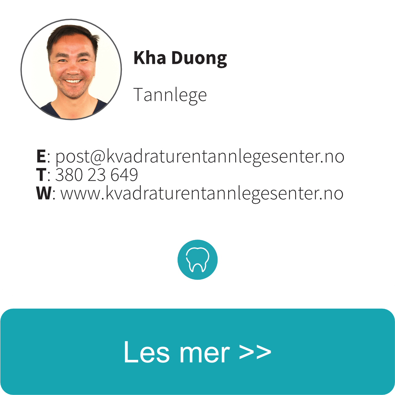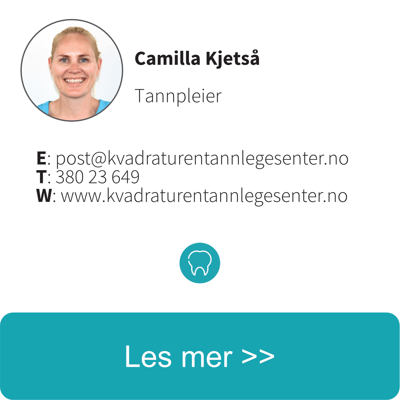 Kvadraturen Tannlegesenter er en moderne tannhelseklinikk som åpnet dørene i desember 2011. Senteret består idag av 3 tannleger, 1 tannpleier og 5 tannhelsesekretærer.