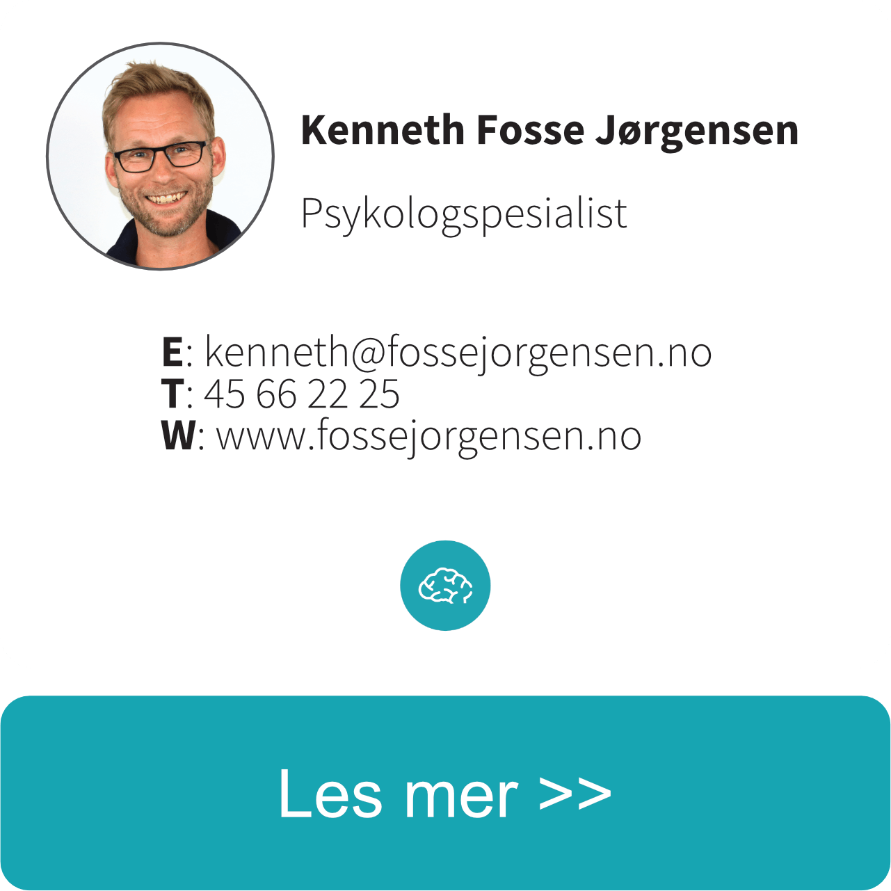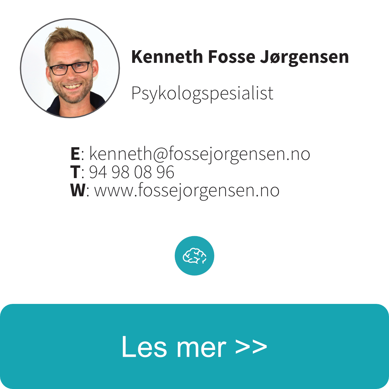 Psykolog Kenneth Fosse Jørgensen er utdannet ved Universitetet i Bergen. Siden 2006 har han jobbet ved Allmenpsykiatrisk poliklinikk, Regional avdeling for spiseforstyrrelser (RASP) og Spesialisert poliklinikk for psykosomatikk og traumer (SPST), før han etablerte fulltids spesialistpraksis ved Helsehuset i 2013.